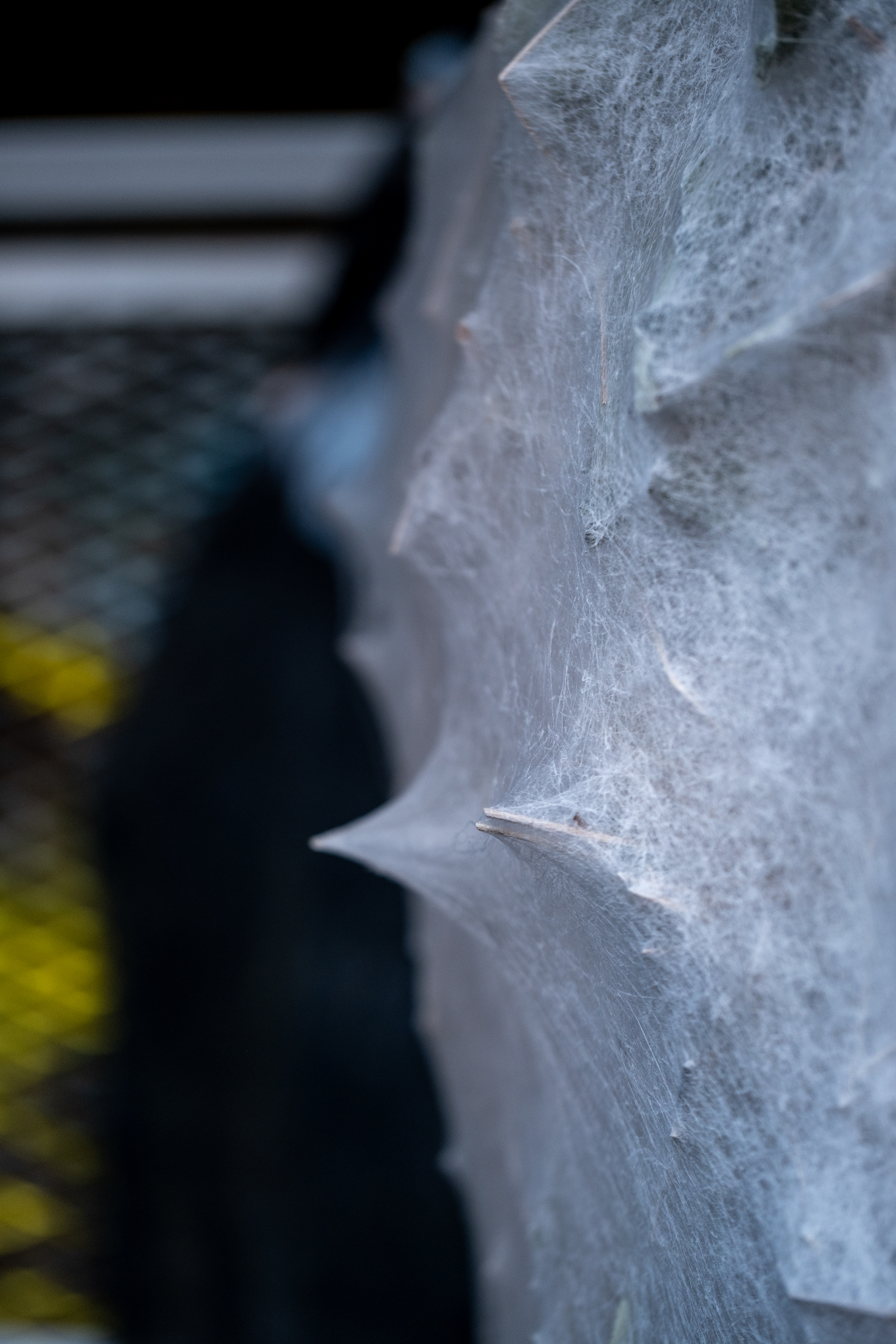 In January 2024 Living Textiles welcomed visiting researcher Jan Konicek from FUA Technical University Liberec to The Hub for Biotechnology in the Built Environment. Working alongside PhD researcher Phoebe Lewis, Jan’s innovative non-woven technology was used to explore new architectural surfaces to develop the Living Nanofiber Pavilion. The technology creates a membrane coating used here in combination with a 3D woven plant-based substructure to form the central structure of the Pavilion.
